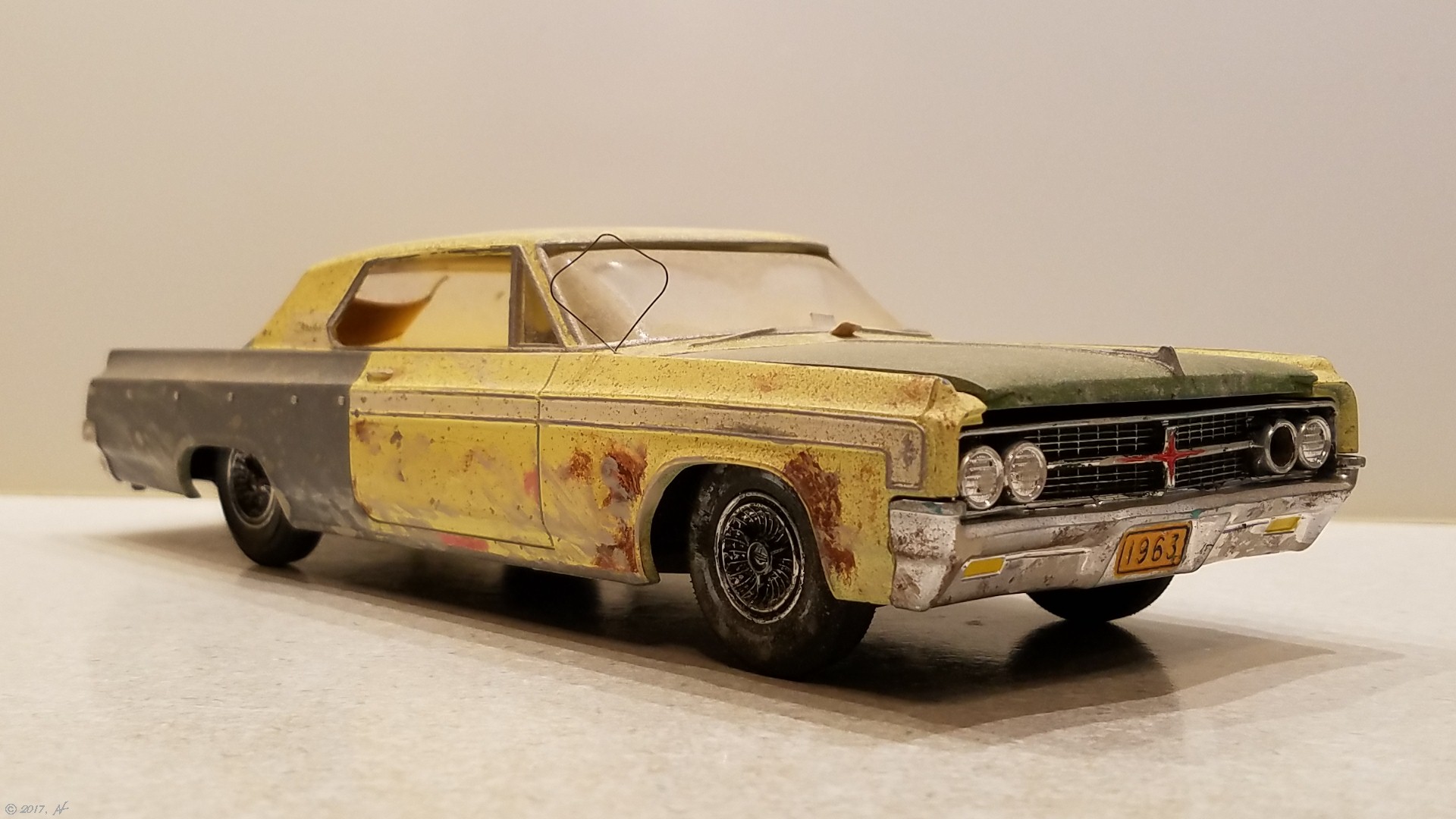 | The body and interior colors are Krylon spray paint and Bond-tite automotive primer. The grill was given depth with a 1:2 mix of Tamyia Flat Black and denatured alcohol. Details, rust and mud splatter are Model Master enamels. The bumper sticker is a dry transfer by Woodland Scenics. |